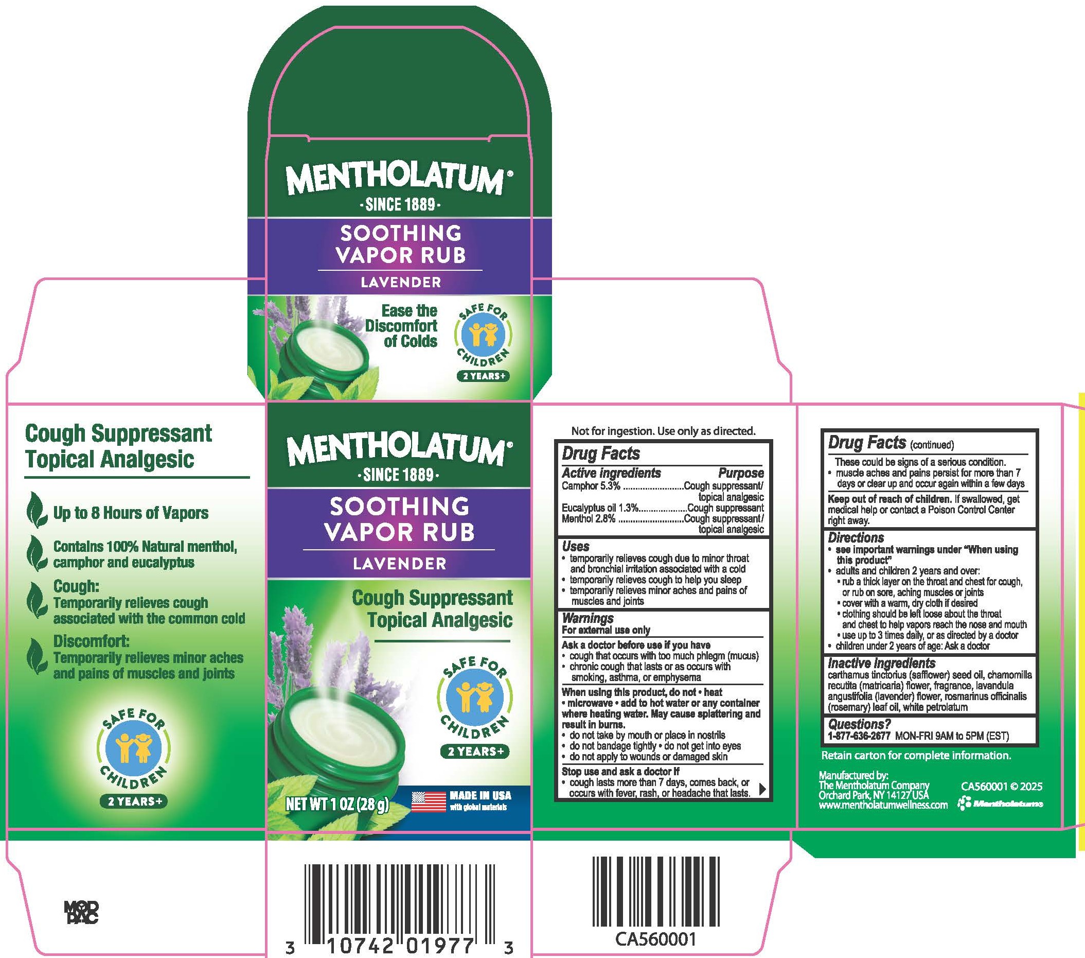 Mentholatum Soothing Vapor Rub Lavender by is a Otc medication manufactured, distributed, or labeled by The Mentholatum Company. Drug facts, warnings, and ingredients follow.