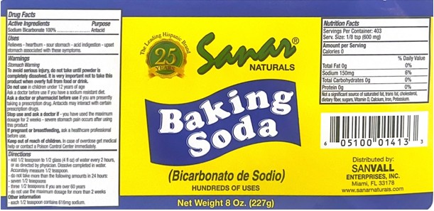 Sanar Baking Soda 8oz by is a Otc medication manufactured, distributed, or labeled by Evi Labs, Evi labs. Drug facts, warnings, and ingredients follow.