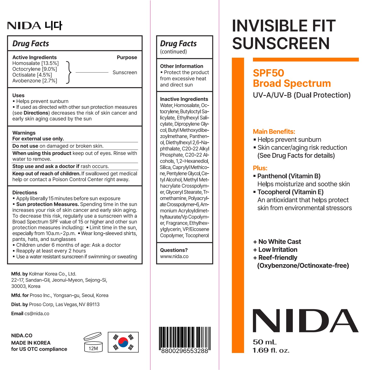 NIDA Invisible Fit Sunscreen by is a Otc medication manufactured, distributed, or labeled by Proso Corp, Kolmar Korea Co., Ltd. Drug facts, warnings, and ingredients follow.