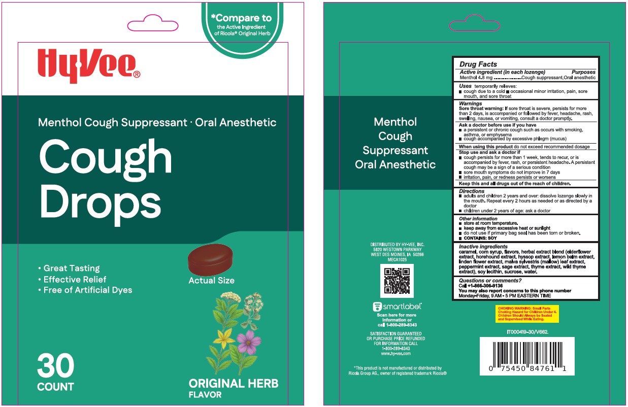 HyVee Cough Drops Original Herb by is a Otc medication manufactured, distributed, or labeled by HY-VEE, INC, Medical Group Care LLC. Drug facts, warnings, and ingredients follow.