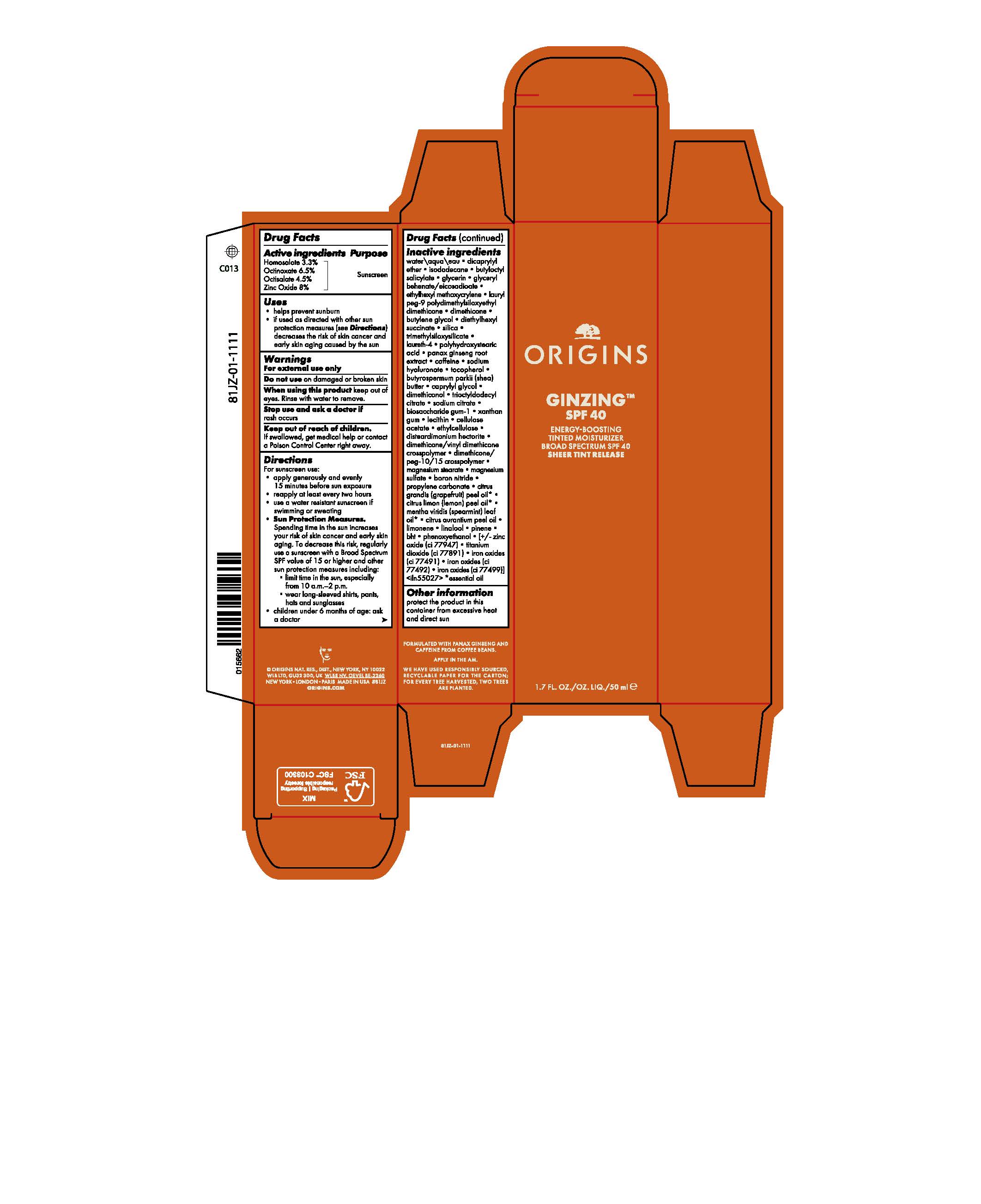 GINZING SPF 40 ENERGY-BOOSTING TINTED MOISTURIZER BROAD SPECTRUM SPF 40 SHEER TINT RELEASE by is a Otc medication manufactured, distributed, or labeled by ORIGINS NATURAL RESOURCES INC., The Estee Lauder Inc. Drug facts, warnings, and ingredients follow.