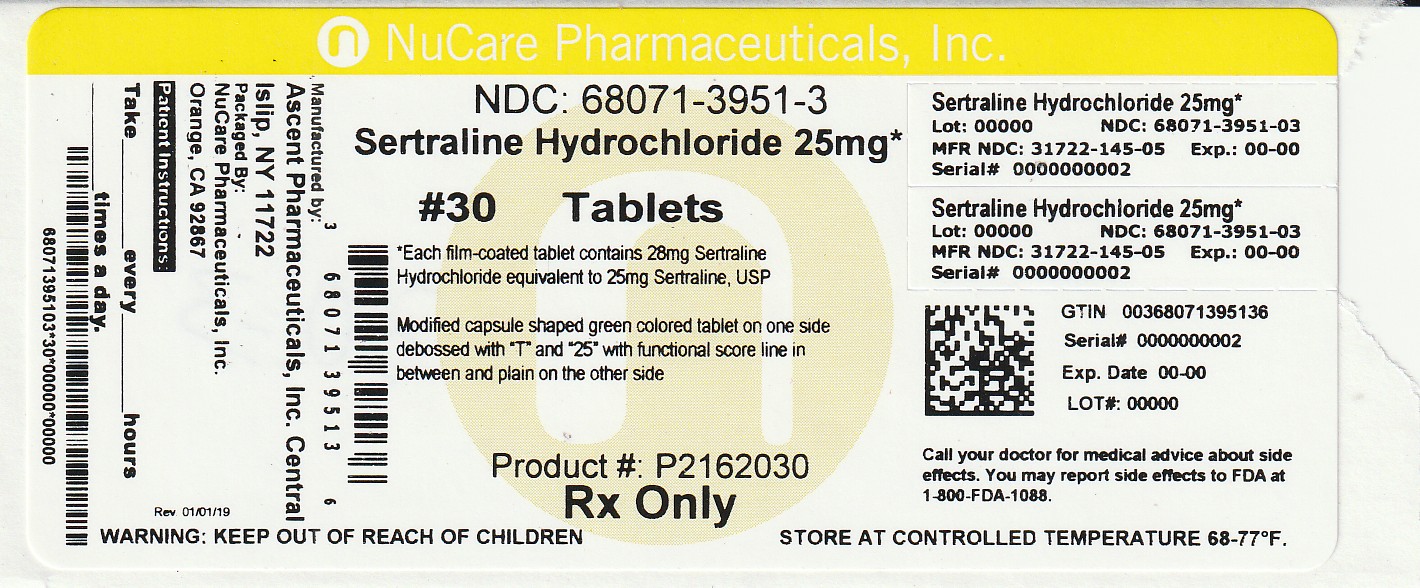 What are the ingredients in sertraline hydrochloride tablets? Active ingredient:Sertraline hydrochloride, USP Inactive ingredients:Microcrystalline cellulose, colloidal silicon dioxide, hydroxypropylcellulose, sodium starch glycolate, magnesium stearate, titanium dioxide, hypromellose, polyethylene glycol and polysorbate 80. The 25 mg and 50 mg strength also contains FD&C blue no. 2. The 25 mg strength also contains D&C yellow no. 10 aluminum lake. 100 mg strength also contains iron oxide yellow, iron oxide red. Medication Guide available at http://camberpharma.com/medication-guides Manufactured by: Ascent Pharmaceuticals, Inc. Central Islip, NY 11722 Manufactured for: Camber Pharmaceuticals, Inc. Piscataway, NJ 08854 |