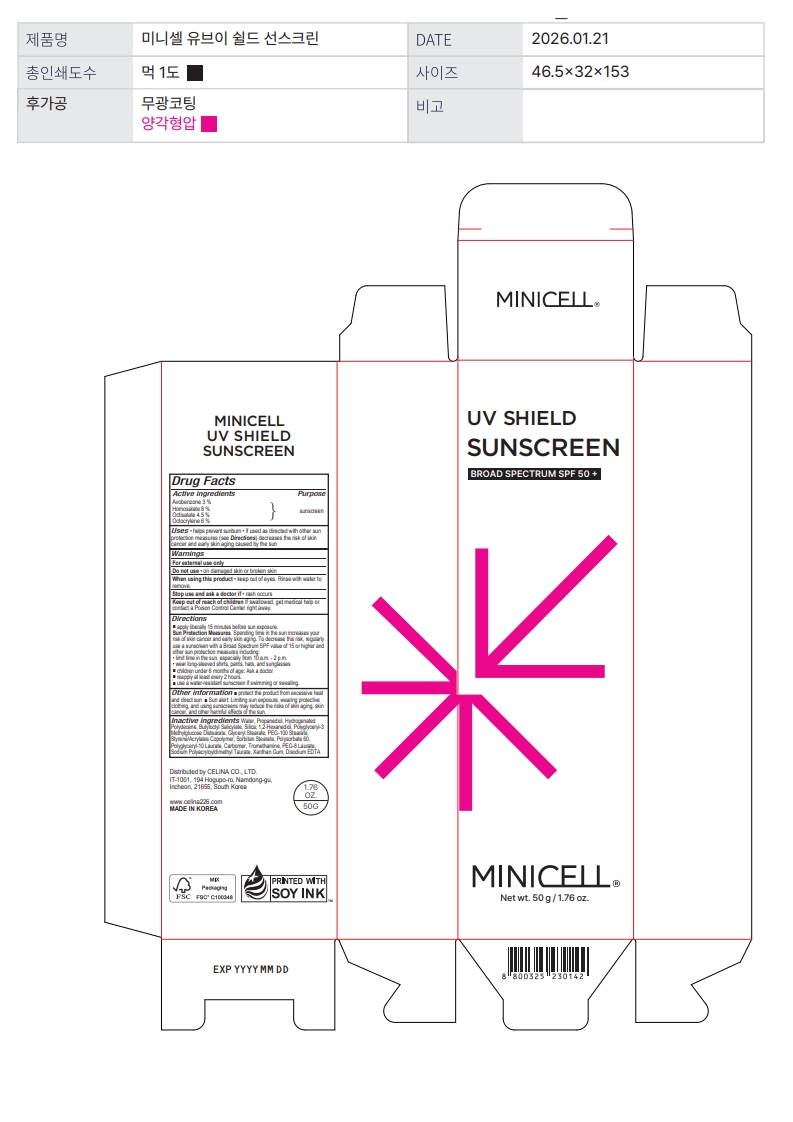 MINICELL UV SHIELD SUNSCREEN by is a Otc medication manufactured, distributed, or labeled by CELINA CO., LTD., Natuzen Co.,Ltd.. Drug facts, warnings, and ingredients follow.