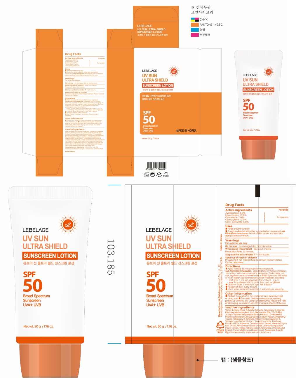 LEBELAGE UV SUN ULTRA SHIELD SUN SCREENLOTION 50g by is a Otc medication manufactured, distributed, or labeled by DONGDONGGURIMOO CO.,LTD., KONAD CO.,LTD.. Drug facts, warnings, and ingredients follow.