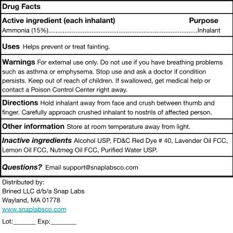 Snap Labs Ammonia Inhalants by is a Otc medication manufactured, distributed, or labeled by Brined LLC d/b/a Snap Labs. Drug facts, warnings, and ingredients follow.