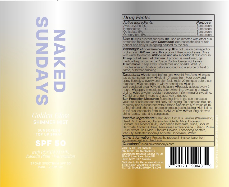 Golden Glow SHIMMER MIST by is a Otc medication manufactured, distributed, or labeled by NAKED SUNDAYS PTY LTD, Prime Matter Labs West. Drug facts, warnings, and ingredients follow.