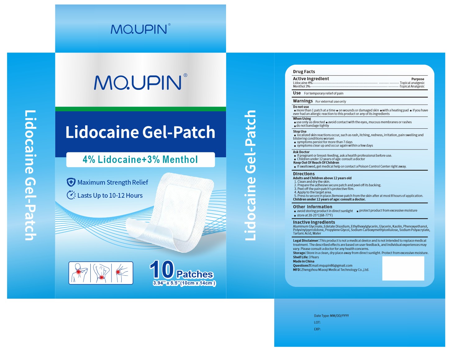 MQUPIN Lidocaine Gel-Patch by is a Otc medication manufactured, distributed, or labeled by Zhengzhou Miaoqi Medical Technology Co., Ltd.. Drug facts, warnings, and ingredients follow.