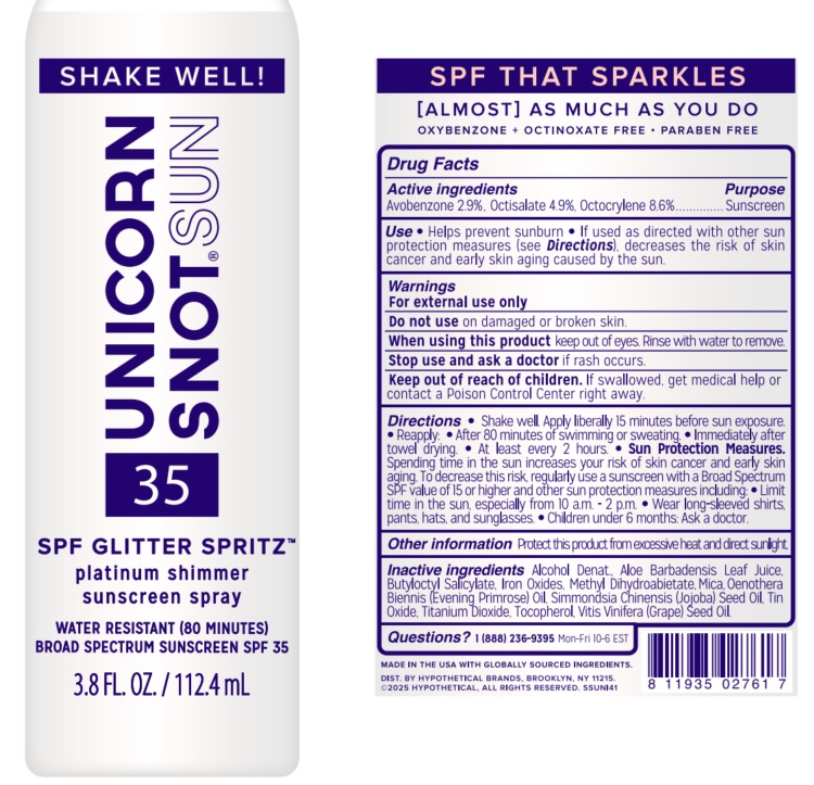 Unicorn Snot 35 SPF Glitter Spritz by is a Otc medication manufactured, distributed, or labeled by Jailbreak Toys, Inc. DBA UNICORN SNOT. Drug facts, warnings, and ingredients follow.