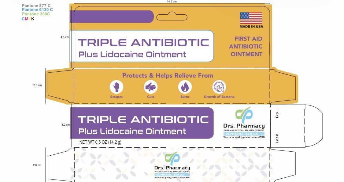 Drs. pharmacy triple antibiotic plus lidocaine by is a Otc medication manufactured, distributed, or labeled by OL PHARMA TECH, LLC, OL PHARMA TECH, LLC Drs PHARMACY. Drug facts, warnings, and ingredients follow.