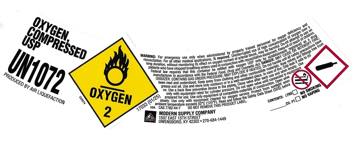 Oxygen by is a Prescription medication manufactured, distributed, or labeled by Modern Supply Company, Inc.. Drug facts, warnings, and ingredients follow.