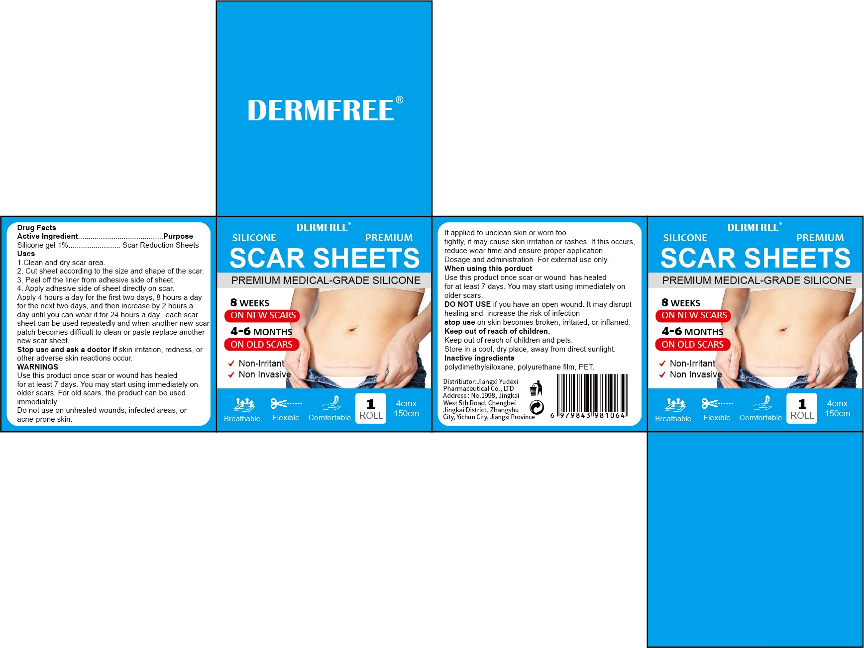 DERMFREE SCAR SHEETS by is a Otc medication manufactured, distributed, or labeled by Jiangxi Yudexi Pharmaceutical Co., LTD. Drug facts, warnings, and ingredients follow.