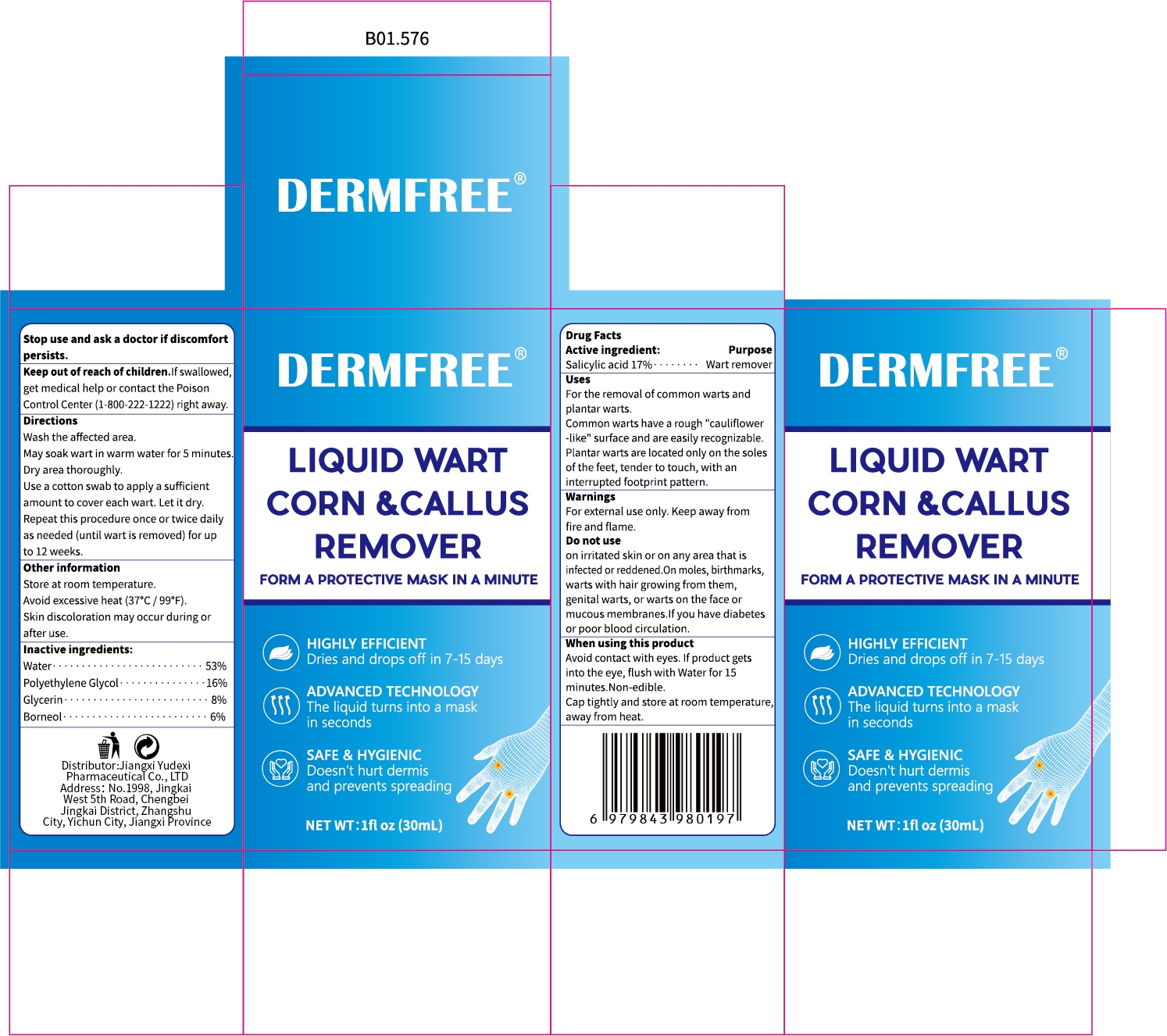 DERMFREE Liquid Wart Corn Callus Remover by is a Otc medication manufactured, distributed, or labeled by Jiangxi Yudexi Pharmaceutical Co., LTD. Drug facts, warnings, and ingredients follow.