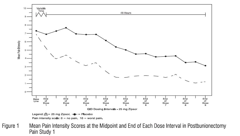 The efficacy of Diclofenac Potassium Capsules in adults was demonstrated in two multicenter, randomized, double-blind, placebo-controlled, parallel arm, multiple-dose clinical trials comparing Diclofenac Potassium Capsules 25 mg and placebo in patients with pain following bunionectomy with osteotomy. Once patients met the criteria for randomization (pain intensity ≥4 on a 0 to 10 numerical pain rating scale) they received their initial dose of study medication followed by a remediation dose when requested by the patient, and were then dosed every six hours over four days. Pain intensity was recorded at 3 and 6 hours postdose during the fixed dosing period. In Study 1, mean baseline pain intensity scores were 6.9 in the Diclofenac Potassium Capsules group (range: 4 to 10) and 7.3 in the placebo group (range: 4 to 10). In both studies, patients treated with Diclofenac Potassium Capsules had a lower mean pain intensity score over the 48-hour inpatient period following the first remediation dose (see Figure 1). The median time to onset of pain relief was less than one hour for Diclofenac Potassium Capsules 25 mg across the clinical trials. The results were similar in Study 2.