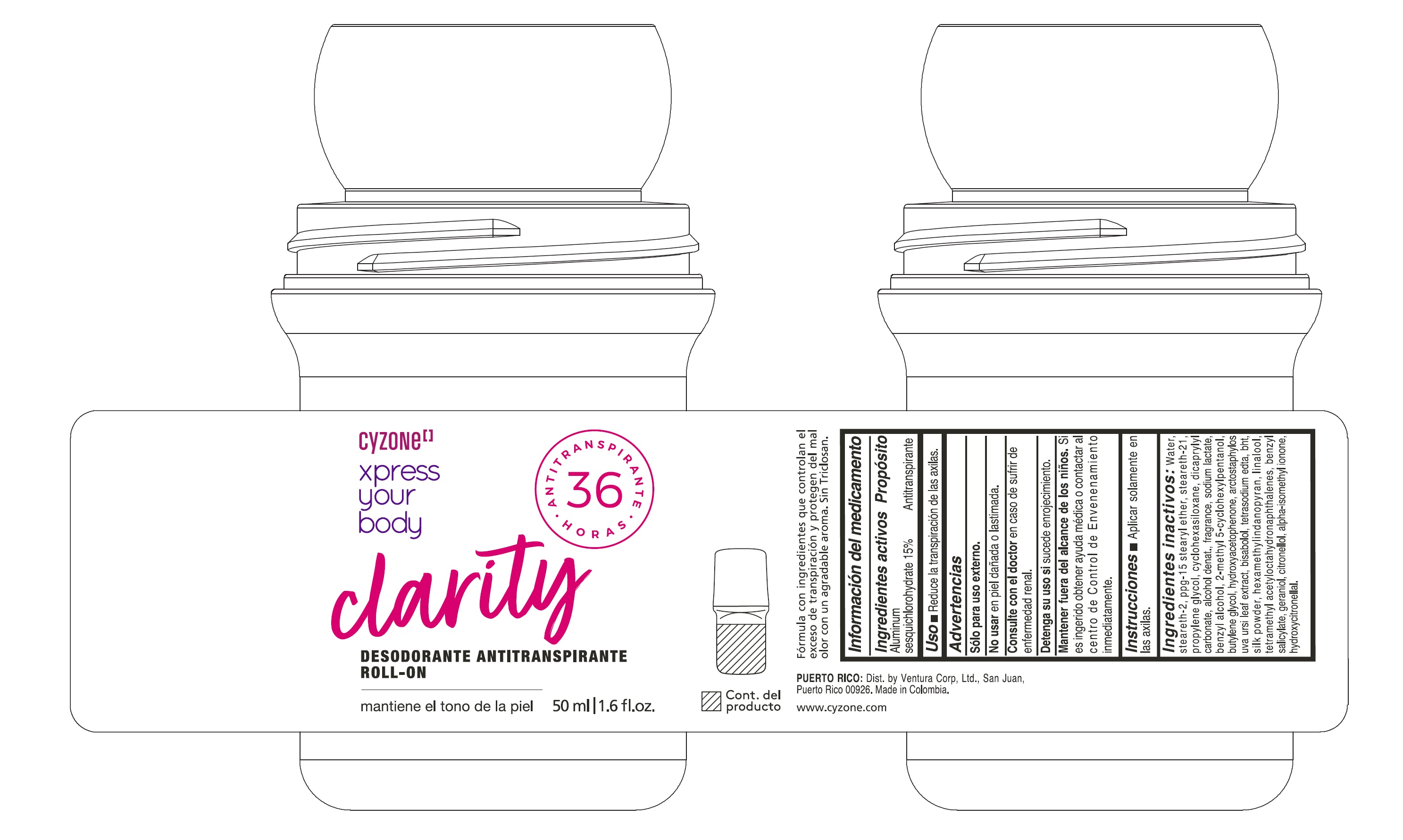 CYZONE XPRESS YOUR BODY CLARITY DESODORANTE ANTITRANSPIRANTE ROLL ON by is a Otc medication manufactured, distributed, or labeled by BEL STAR S A. Drug facts, warnings, and ingredients follow.