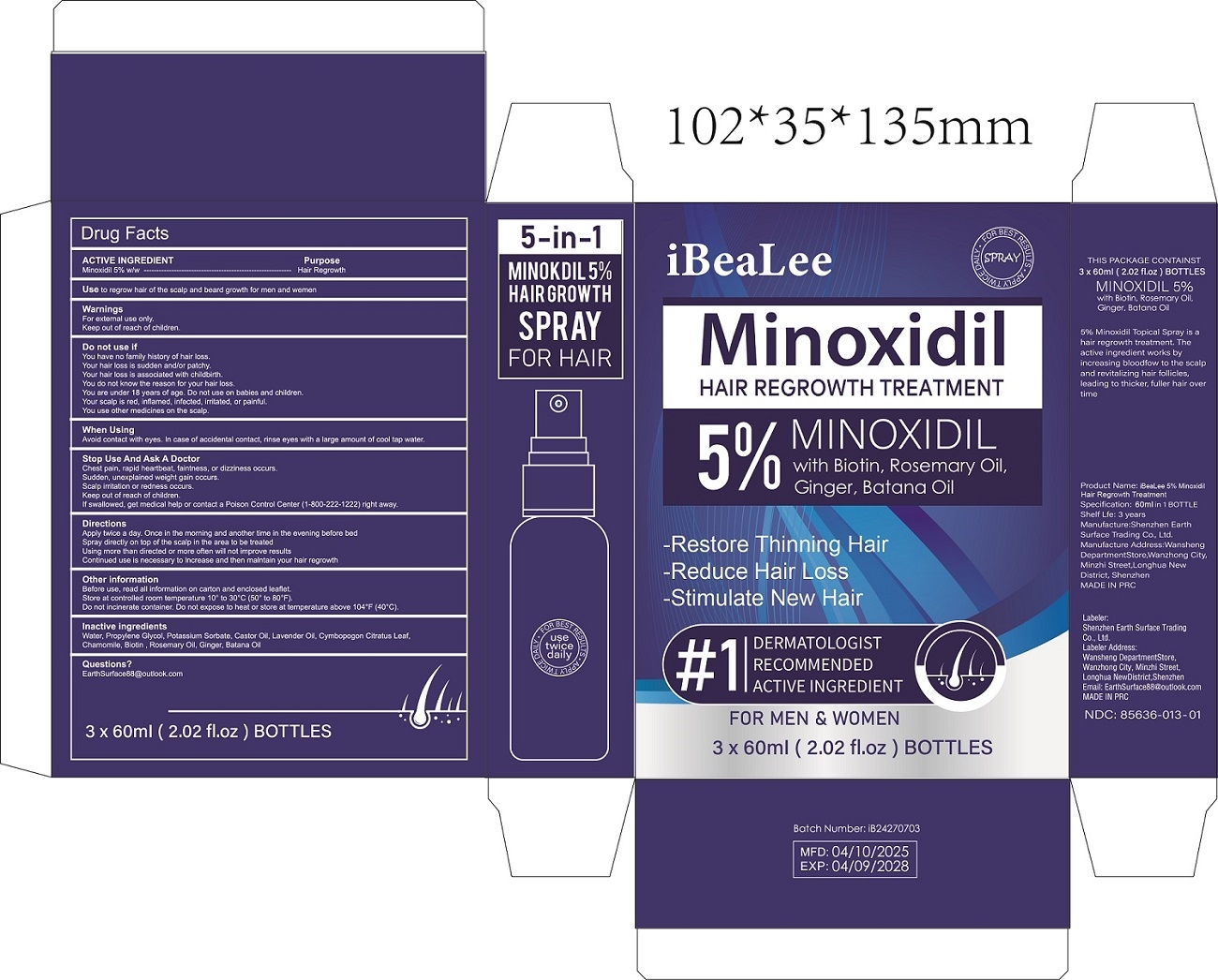 iBeaLee 5% Minoxidil Hair Regrowth Treatment by is a Otc medication manufactured, distributed, or labeled by Shenzhen Earth Surface Trading Co., Ltd.. Drug facts, warnings, and ingredients follow.