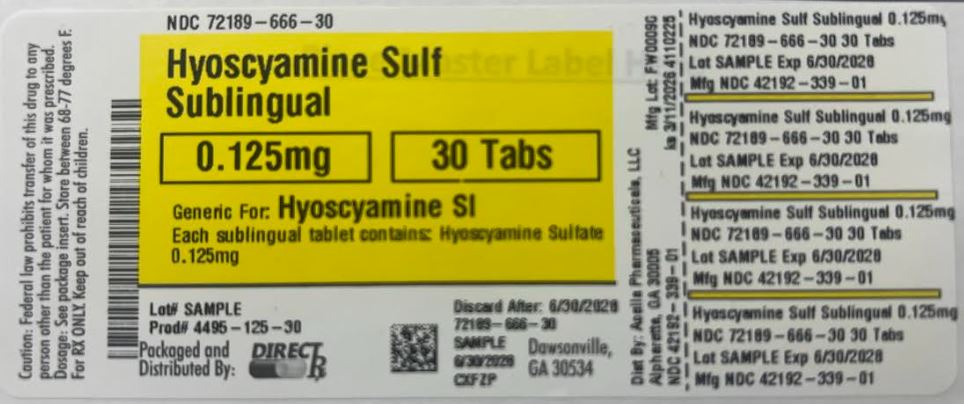 Hyoscyamine Sulfate SLis supplied as round, green, peppermint flavored tablets with "39" debossed on one side. They are available in bottles of 30 tablets, NDC: 72189-666-30.