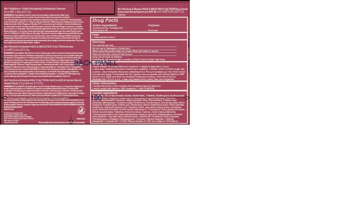 No7 Restore and Renew Face and Neck Multi Action Day Cream Sunscreen Broad Spectrum SPF 30 by is a Otc medication manufactured, distributed, or labeled by BCM Ltd, The Boots Company PLC, BCM Cosmetique SAS. Drug facts, warnings, and ingredients follow.