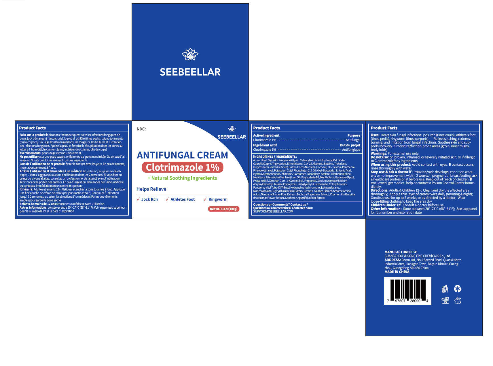 seebeellar clotrimazole 1% antifungal cream by is a Otc medication manufactured, distributed, or labeled by GUANGZHOU YUSONG FINE CHEMICLS Co., Ltd. Drug facts, warnings, and ingredients follow.