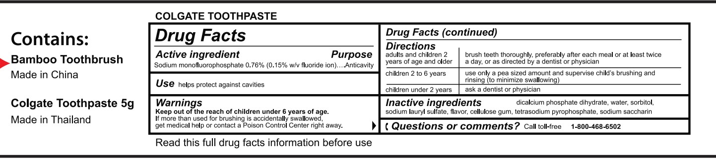 Colgate 5g Toothbrush Kit by is a Otc medication manufactured, distributed, or labeled by Wuhan Jinshengyuan Textiles Manufacturing Co., Ltd.. Drug facts, warnings, and ingredients follow.