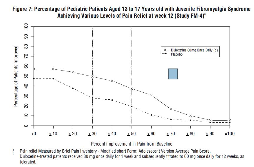 The recommended starting duloxetine delayed-release capsule dosage in pediatric patients 13 to17 years of age with fibromyalgia is 30 mg once daily. The dosage may be increased to 60 mg once daily based on response and tolerability.
