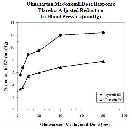 The antihypertensive effects of olmesartan medoxomil have been demonstrated in seven placebo-controlled studies at doses ranging from 2.5 mg to 80 mg for 6 to 12 weeks, each showing statistically significant reductions in peak and trough blood pressure. A total of 2693 patients (2145 olmesartan medoxomil; 548 placebo) with essential hypertension were studied. Olmesartan medoxomil once daily lowered diastolic and systolic blood pressure. The response was dose related, as shown in the following graph. An olmesartan medoxomil dose of 20 mg daily produces a trough sitting blood pressure (BP) reduction over placebo of about 10/6 mmHg and a dose of 40 mg daily produces a trough sitting BP reduction over placebo of about 12/7 mmHg. Olmesartan medoxomil doses greater than 40 mg had little additional effect. The onset of the antihypertensive effect occurred within 1 week and was largely manifest after 2 weeks.
