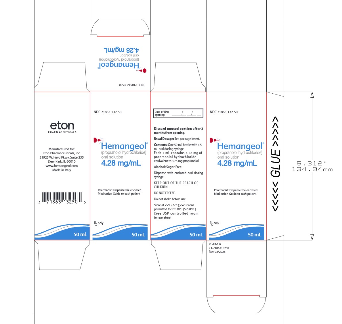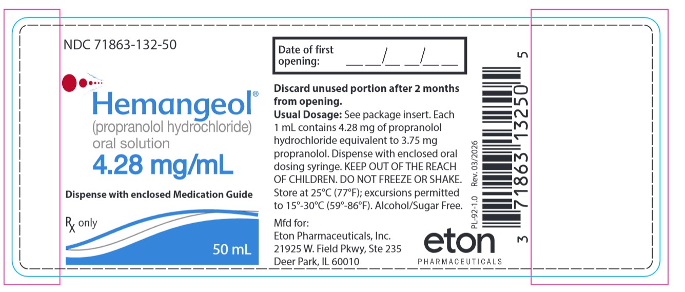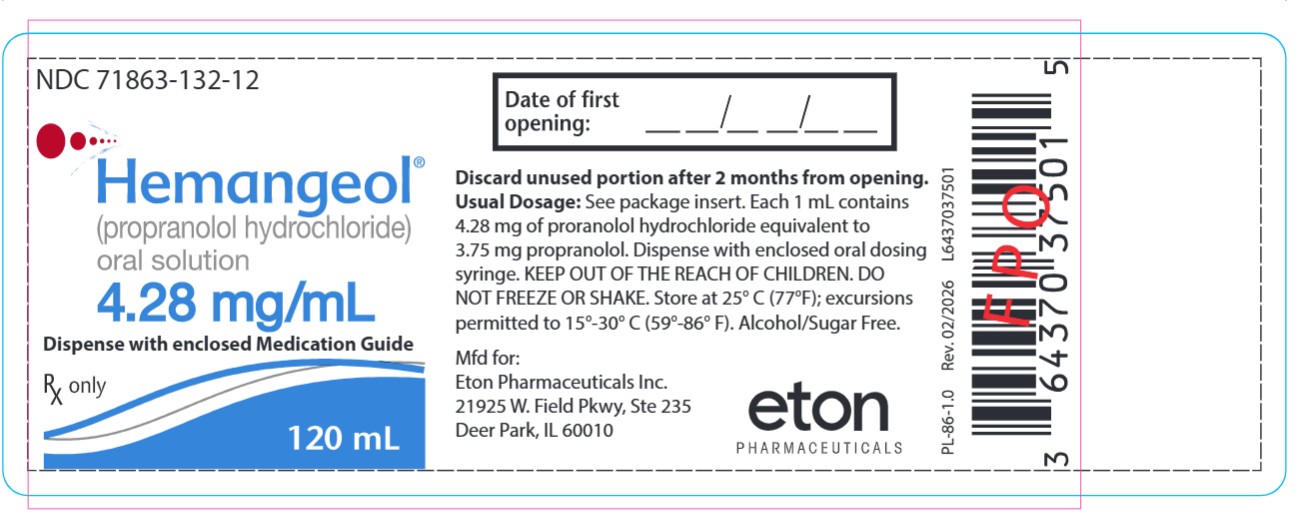 17 PATIENT COUNSELING INFORMATION See FDA-approved patient labeling (Medication Guide and Instructions for Use). Patient advice Advise parents or caregivers to read the FDA-approved patient labeling (Medication Guide and Instructions for Use). Instructions for using oral dosing syringe Instruct parents or caregivers on use of the oral dosing syringe. Risk of hypoglycemia Inform parents or caregivers that there is a risk of hypoglycemia while on HEMANGEOL. Hypoglycemia can occur at any time during treatment. Instruct caregivers to skip dosing in patients who are fasting (e.g., poor oral food intake, infection, vomiting), or when glucose demands are increased (e.g., cold, stress, infections). Instruct parents or caregivers how to recognize the signs of hypoglycemia. Tell them to discontinue HEMANGEOL if hypoglycemia develops and call their health care provider immediately or take the child to the emergency room [see Warnings and Precautions 5.1] Cardiovascular risks Advise parents or caregivers that there is a potential risk for bradycardia, aggravation of pre-existing conduction disorders, and hypotension associated with the use of HEMANGEOL. Instruct them to contact their healthcare provider in case of fatigue, pallor, slow or uneven heart beats, peripheral coldness or fainting. Respiratory risks Inform parents or caregivers that HEMANGEOL carries risk of bronchospasm or exacerbation of lower respiratory tract infections. Instruct them to contact their healthcare provider or go to the nearest hospital emergency room if their child has breathing problems or wheezing during treatment with HEMANGEOL. Other risks Inform parents or caregivers that changes in sleep patterns may occur during HEMANGEOL therapy. Ask parents or caregivers to tell you all the medications they are administering to their child including prescription and over the counter medicines, vitamins, and herbal supplements. Ask breastfeeding mothers to tell you all the medications they are currently taking, as these may pass into the milk. Manufactured for: Eton Pharmaceuticals, Inc., Deer Park, IL 60010 ©2026 Eton Pharmaceuticals, Inc. All rights reserved.