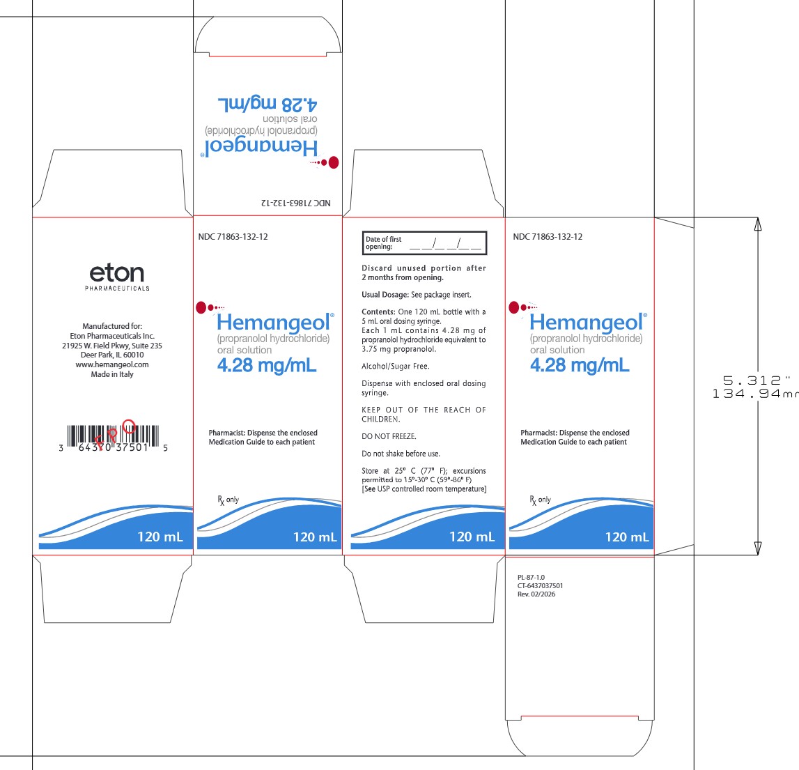 16.1 How Supplied HEMANGEOL is supplied as an oral solution. Each 1 mL contains 4.28 mg propranolol. HEMANGEOL is supplied in a carton containing one bottle with syringe adapter and one 5-mL oral dosing syringe. NDC: 71863-132-12 Bottle 120 mL NDC: 71863-132-50 Bottle 50 mL 16.2 Storage and Handling Store at 25ºC (77ºF); excursions permitted from 15º to 30ºC (59º to 86ºF). [See USP Controlled Room Temperature.] Do not freeze. Do not shake the bottle before use. Dispense in original container with enclosed oral dosing syringe. The product can be kept for 2 months after first opening. See instructions for using enclosed oral dosing syringe.