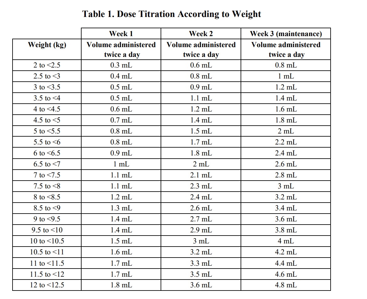 Initiate treatment at ages 5 weeks to 5 months. (2) Starting dose is 0.15 mL/kg (0.6 mg/kg) twice daily. After 1 week, increase dose to 0.3 mL/kg (1.1 mg/kg) twice daily. After 2 weeks, increase to a maintenance dose of 0.4 mL/kg (1.7 mg/kg) twice daily.(2) Administer doses at least 9 hours apart during or after feeding. (2) Readjust dose for changes in the child’s weight. (2) Monitor heart rate and blood pressure for 2 hours after the first dose or increasing dose. (2) (2)
