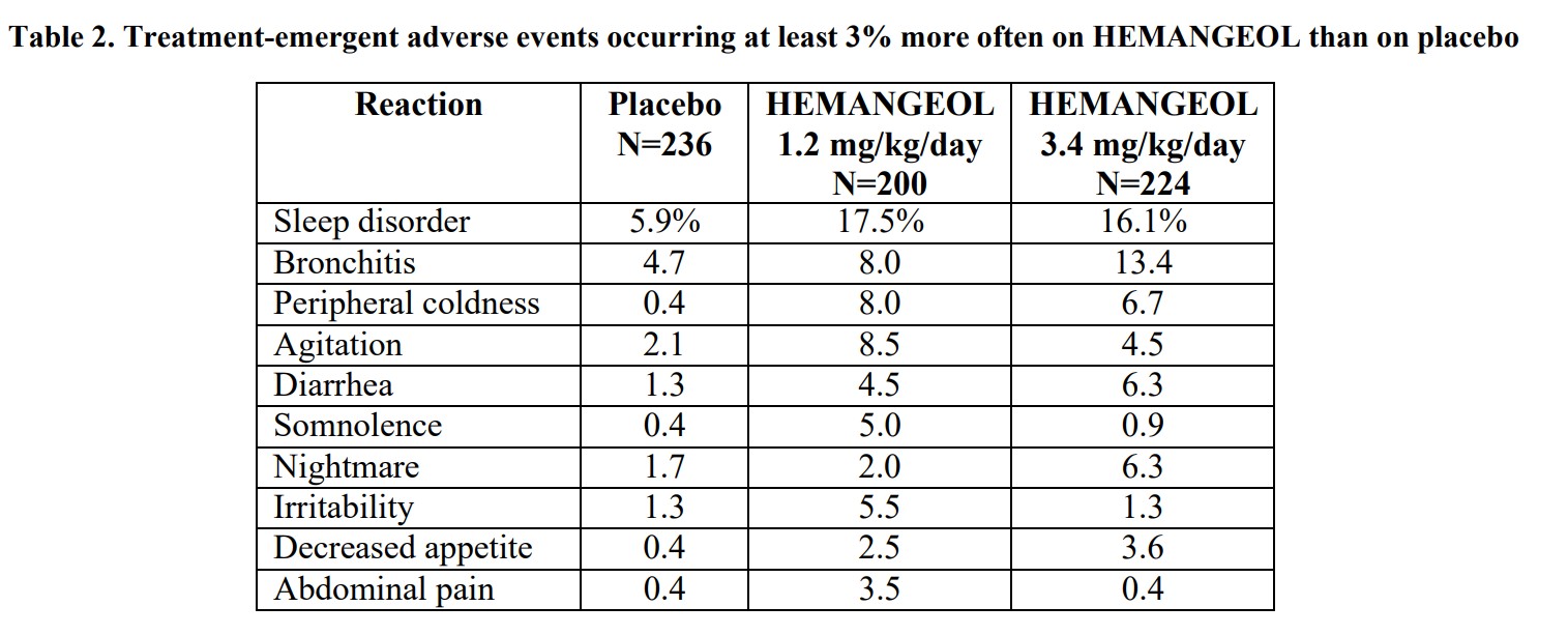 Because clinical trials are conducted under widely varying conditions, adverse reaction rates observed in the clinical trials of a drug may not reflect the rates observed in clinical practice. 4 Clinical Trials Experience with HEMANGEOL in Infants with proliferating infantile hemangioma In clinical trials for proliferating infantile hemangioma, the most frequently reported adverse reactions (>10%) in infants treated with HEMANGEOL were sleep disorders, aggravated respiratory tract infections such as bronchitis and bronchiolitis associated with cough and fever, diarrhea, and vomiting. Adverse reactions led to treatment discontinuation in fewer than 2% of treated patients. Overall, 479 patients in the pooled safety population were exposed to study drug in the clinical study program (456 in placebo-controlled trials). A total of 424 patients were treated with HEMANGEOL at doses 1.2 mg/kg/day or 3.4 mg/kg/day for 3 or 6 months. Of these, 63% of patients were aged 91-150 days and 37% were aged 35-90 days at randomization. The following table lists according to the dosage the most common adverse reactions (treatment-emergent adverse events with an incidence at least 3% greater on one of the two doses than on placebo).
