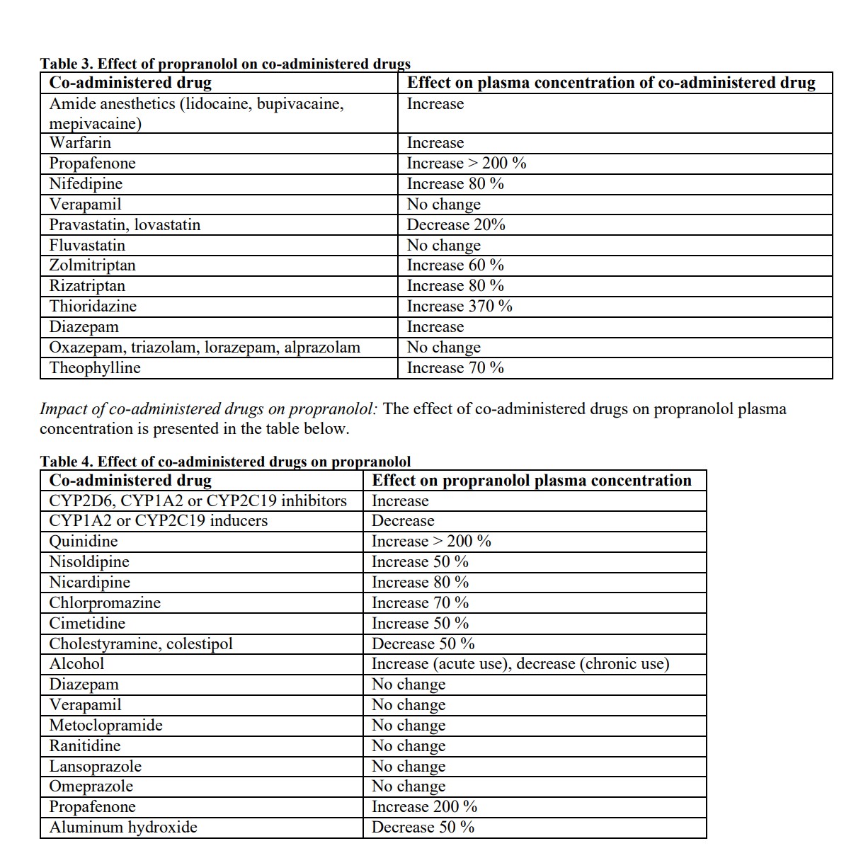 12.3 Pharmacokinetics Adults Absorption: Propranolol is almost completely absorbed after oral administration. However, it undergoes an extensive first-pass metabolism by the liver and on average; only about 25% of propranolol reaches the systemic circulation. Peak plasma concentrations occur about 1 to 4 hours after an oral dose. Administration of protein-rich foods increases the bioavailability of propranolol by about 50% with no change in time to peak concentration. Propranolol is a substrate for the intestinal efflux transporter, P-glycoprotein (P-gp). However, studies suggest that P-gp is not dose-limiting for intestinal absorption of propranolol in the usual therapeutic dose range. Distribution: Approximately 90% of circulating propranolol is bound to plasma proteins (albumin and alpha1 acid glycoprotein). The volume of distribution of propranolol is approximately 4 L/kg. Propranolol crosses the blood-brain 7 barrier and the placenta, and is distributed into breast milk. Propranolol is extensively metabolized with most metabolites appearing in the urine. Metabolism: Propranolol is metabolized through three primary routes: aromatic hydroxylation (mainly 4- hydroxylation), N-dealkylation followed by further side-chain oxidation, and direct glucuronidation. The percentage contributions of these routes to total metabolism are 42%, 41% and 17%, respectively, but with considerable variability between individuals. The four major final metabolites are propranolol glucuronide, naphthyloxylactic acid and glucuronic acid, and sulfate conjugates of 4-hydroxy propranolol. In vitro studies indicated that CYP2D6 (aromatic hydroxylation), CYP1A2 (chain oxidation) and to a less extent CYP2C19 were involved in propranolol metabolism. In healthy subjects, no difference was observed between CYP2D6 extensive metabolizers (EMs) and poor metabolizers (PMs) with respect to oral clearance or elimination half-life. Elimination: The plasma half-life of propranolol ranges from 3 to 6 hours. Less than 1% of a dose is excreted as unchanged drug in the urine. Infants The pharmacokinetics of propranolol and 4-OH-propranolol were evaluated in a multiple dose 12 week study conducted in 23 male and female infants 35 to 150 days of age with hemangioma. The infants were stratified by age (35 to 90 days and 91 to 150 days). The starting dose was 1.2 mg/kg/day which was titrated to the target dose of 3.4 mg/kg/day in 1.1 mg/kg/day increments at weekly intervals. At steady state, following administration of 3.4 mg/kg/day twice daily, peak plasma propranolol concentrations were observed within 2 hours of oral administration. Clearance of propranolol in infants was similar across the age range studied (2.7 (SD=0.03) L/h/kg in infants <90 days of age and 3.3 (SD=0.35) L/h/kg in infants >90 days of age) and to that in adults when adjusted by body weight. The median elimination half-life of propranolol was about 3.5 hours. Plasma propranolol concentrations approximate a dose proportional increase in the dose range of 1.2 mg/kg/day to 3.4 mg/kg/day. Plasma concentration of 4-OH-propranolol, the main metabolite, was about 5% of total plasma exposure of propranolol. Sex There is no known dependence of pharmacokinetics of propranolol by sex in infants. Race There is little information on dependence of pharmacokinetics of propranolol by race in infants. A study conducted in 12 Caucasian and 13 African-American adult male subjects taking propranolol, showed that at steady state, the clearance of R(+)- and S(-)-propranolol were about 76% and 53% higher in African-Americans than in Caucasians, respectively. Chinese adult subjects had a greater proportion (18% to 45% higher) of unbound propranolol in plasma compared to Caucasians, which was associated with a lower plasma concentration of alpha1 acid glycoprotein. Drug Interaction Studies Impact of propranolol on co-administered drugs: The effect of propranolol on plasma concentration of coadministered drug is presented in the table below.