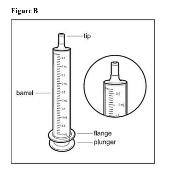 Step 3. Remove the oraldosing syringe from the plastic bag. Safely throw the plastic bag away. The barrelof the syringe has markings in milliliters (mL). Look at themarkings on the barrelof the oraldosing syringe and find the mL marking that matches the HEMANGEOL dose in mL prescribed by your doctor (See Figure B)