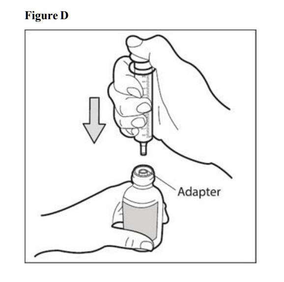 Step 5. Place the bottle on your work surface. Use one hand to hold the bottle upright. Use your other hand to insert the tip of the oral dosing syringe into the syringe adapter at the top of the bottle. Push the plunger all the way down (See Figure D). Do not remove the syringe adapter. If the syringe adapter is missing talk to your pharmacist.