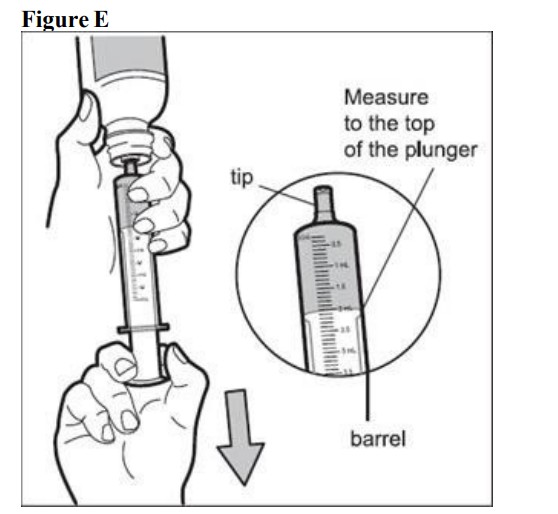 Step 6: Use one hand to hold the oral dosing syringe in place. With your other hand, turn the bottle upside down. Pullback on the plunger untilthe top of the plunger lines up with the marking on the barrel of the syringe that matches the dose of HEMANGEOL prescribed by your doctor (See Figure E). Your child’s dose may be different than the dose shown in Figure E.