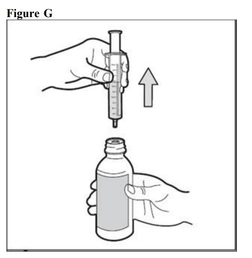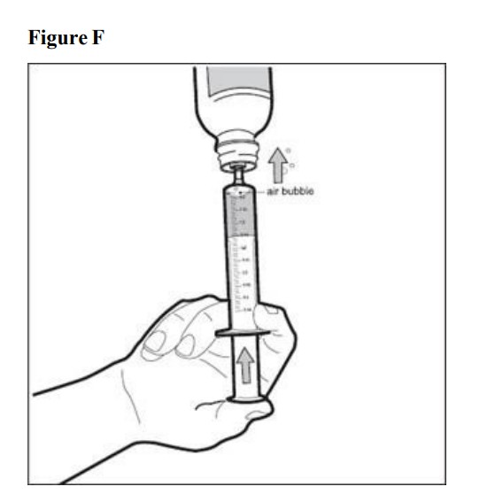 Step 7: Check for air bubbles in the oral dosing syringe. If you see air bubbles, push up on the plungertowards the bottle just enough to remove any large air bubbles and then pullback to the measured dose (See Figure F).