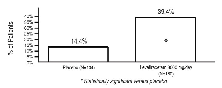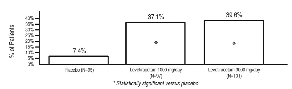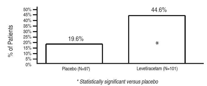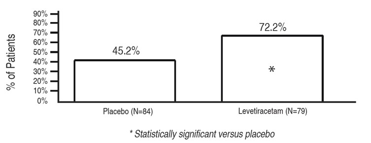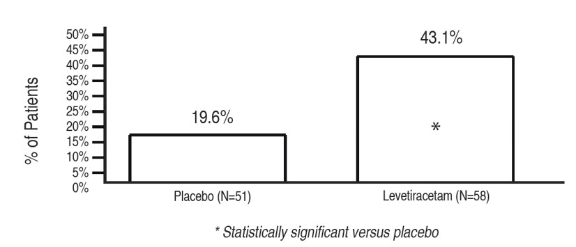 Study 1 was a double-blind, placebo-controlled, parallel-group study conducted at 41 sites in the United States comparing levetiracetam 1000 mg/day (N=97), levetiracetam 3000 mg/day (N=101), and placebo (N=95) given in equally divided doses twice daily. After a prospective baseline period of 12 weeks, patients were randomized to one of the three treatment groups described above. The 18-week treatment period consisted of a 6-week titration period, followed by a 12-week fixed dose evaluation period, during which concomitant AED regimens were held constant. The primary measure of effectiveness was a between group comparison of the percent reduction in weekly partial seizure frequency relative to placebo over the entire randomized treatment period (titration + evaluation period). Secondary outcome variables included the responder rate (incidence of patients with ≥50% reduction from baseline in partial-onset seizure frequency). The results of the analysis of Study 1 are displayed in Table 10.