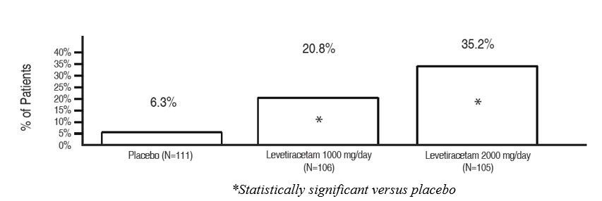 Study 6 was a multicenter, randomized, double-blind, placebo-controlled study in patients 12 years of age and older with juvenile myoclonic epilepsy (JME) experiencing myoclonic seizures. Study 6 was conducted at 37 sites in 14 countries. Eligible patients on a stable dose of 1 antiepileptic drug (AED) experiencing one or more myoclonic seizures per day for at least 8 days during the prospective 8-week baseline period were randomized to either levetiracetam or placebo (levetiracetam N=60, placebo N=60). Patients were titrated over 4 weeks to a target dose of 3000 mg/day and treated at a stable dose of 3000mg/day over 12 weeks (evaluation period). Study drug was given in 2 divided doses. The primary measure of efficacy was the proportion of patients with at least 50% reduction in the number of days per week with one or more myoclonic seizures during the treatment period (titration + evaluation periods) as compared to baseline. Table 14 displays the results for the 113 patients with JME in this study. Of 120 patients enrolled, 113 had a diagnosis of confirmed or suspected JME. The results of Study 6 are displayed in Table 14.
