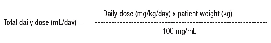 Initiate treatment with a daily dose of 14 mg/kg in 2 divided doses (7 mg/kg twice daily). Increase the daily dose every 2 weeks by increments of 14 mg/kg to the recommended daily dose of 42 mg/kg (21 mg/kg twice daily). In the clinical trial, the mean daily dose was 35 mg/kg in this age group.