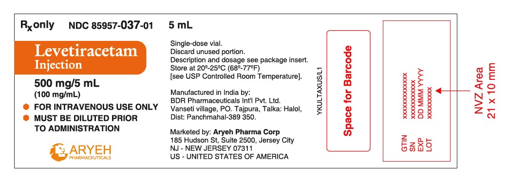 Levetiracetam 500 mg/5 mL injection is a clear, colorless, sterile solution. It is supplied in single-use 5 mL vials, available in cartons of 10 vials (NDC: 85957-037-01).