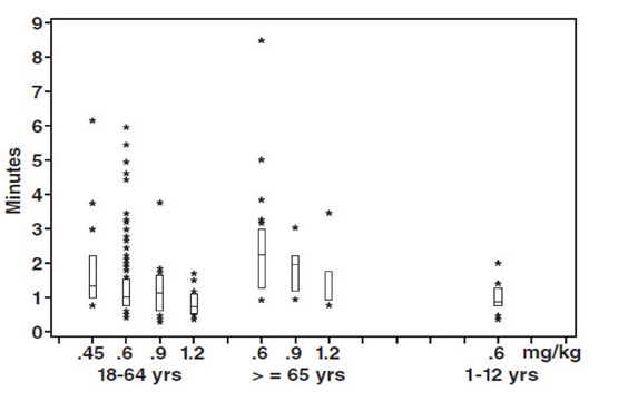 A lower dose of rocuronium bromide (0.45 mg/kg) may be used. Neuromuscular block sufficient for intubation (80% block or greater) is attained in a median (range) time of 1.3 (0.8 to 6.2) minute(s) and most patients have intubation completed within 2 minutes. Maximum blockade is achieved in most patients in less than 4 minutes. This dose may be expected to provide 22 (12 to 31) minutes of clinical relaxation under opioid/nitrous oxide/oxygen anesthesia. Patients receiving this low dose of 0.45 mg/kg who achieve less than 90% block (about 16% of these patients) may have a more rapid time to 25% recovery, 12 to 15 minutes.