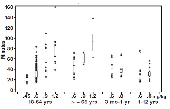 Rocuronium bromide 0.45, 0.6, or 1 mg/kg was evaluated under sevoflurane (induction) and isoflurane/nitrous oxide (maintenance) anesthesia for intubation in 326 patients in 2 studies. In 1 of these studies maintenance bolus and infusion requirements were evaluated in 137 patients. In all age groups, doses of 0.6 mg/kg provided time to maximum block in about 1 minute. Across all age groups, median (range) time to reappearance of T 3for doses of 0.6 mg/kg was shortest in the children [36.7 (20.1 to 65.9) minutes] and longest in infants [59.8 (32.3 to 87.8) minutes]. For pediatric patients older than 3 months, the time to recovery was shorter after stopping infusion maintenance when compared with bolus maintenance [ see Dosage and Administration (2.6)and Use in Specific Populations (8.4)].
