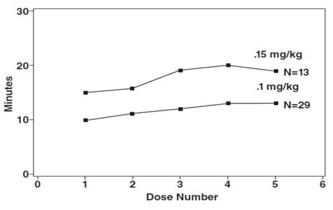 The recommended initial dose of rocuronium bromide, regardless of anesthetic technique, is 0.6 mg/kg. Neuromuscular block sufficient for intubation (80% block or greater) is attained in a median (range) time of 1 (0.4 to 6) minute(s) and most patients have intubation completed within 2 minutes. Maximum blockade is achieved in most patients in less than 3 minutes. This dose may be expected to provide 31 (15 to 85) minutes of clinical relaxation under opioid/nitrous oxide/oxygen anesthesia. Under halothane, isoflurane, and enflurane anesthesia, some extension of the period of clinical relaxation should be expected