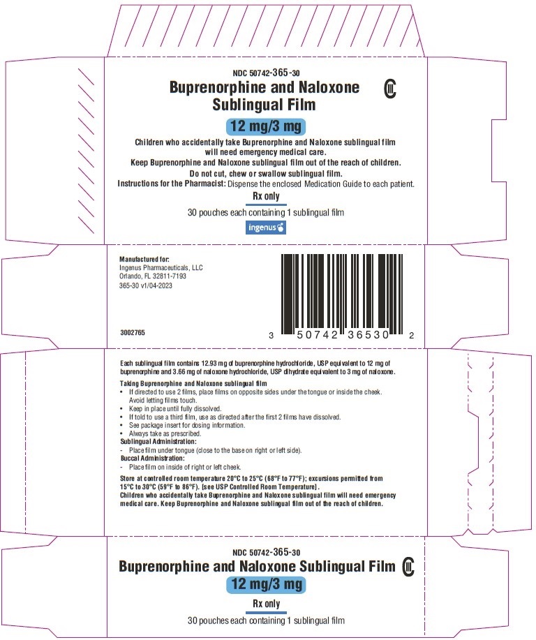 Buprenorphine 12 mg and naloxone 3 mg sublingual film is supplied as a rectangular orange film, which contains whitish particulates dispersed throughout the film and areas of lighter color, when observed against the aluminized side of the pouchstock material. The film is imprinted with “12” in blue ink (“12” may appear to be green in color), The pouch has a tear-notch.