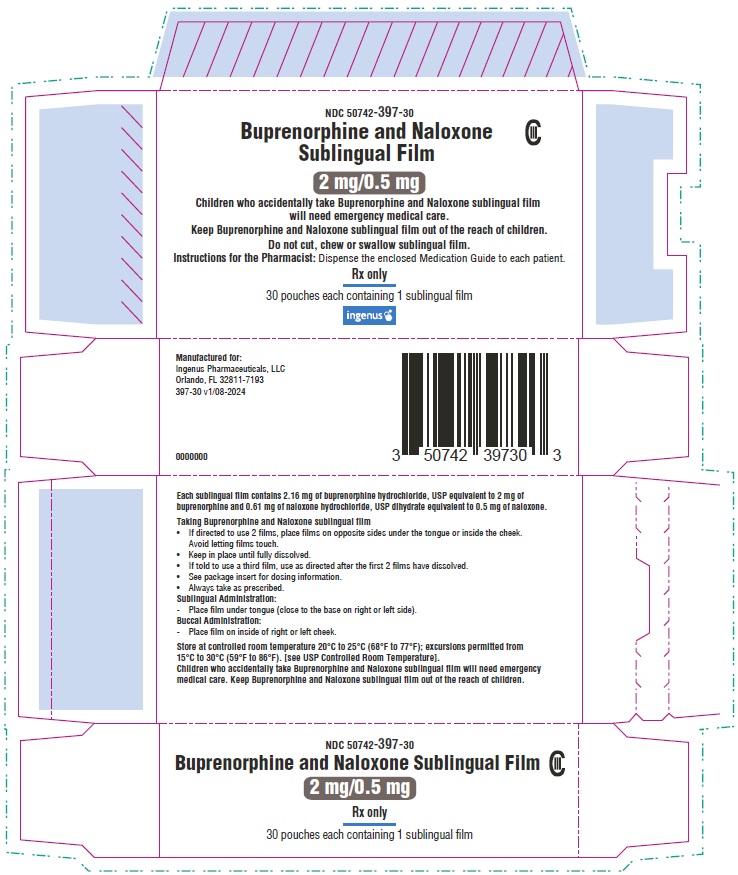 Buprenorphine 2 mg and naloxone 0.5 mg sublingual film is supplied as a rectangular orange film, which contains whitish particulates dispersed throughout the film and areas of lighter color, when observed against the aluminized side of the pouchstock material. The film is imprinted with “2” in blue ink (“2” may appear to be green in color). The pouch has a tear-notch.