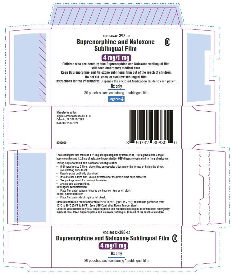 Buprenorphine 4 mg and naloxone 1 mg sublingual film is supplied as a rectangular orange film, which contains whitish particulates dispersed throughout the film and areas of lighter color, when observed against the aluminized side of the pouchstock material. The film is imprinted with “4” in blue ink (“4” may appear to be green in color), The pouch has a tear-notch.