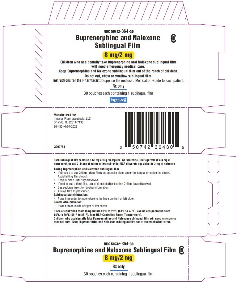 Buprenorphine 8 mg and naloxone 2 mg sublingual film is supplied as a rectangular orange film, which contains whitish particulates dispersed throughout the film and areas of lighter color, when observed against the aluminized side of the pouchstock material. The film is imprinted with “8” in blue ink (“8” may appear to be green in color), The pouch has a tear-notch.