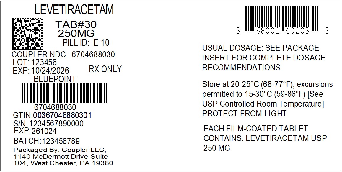 Levetiracetam Tablets USP, 250 mgare blue oval shaped biconvex film-coated tablets debossed with a deep break line separating ‘E’ and ‘10’ on one side and plain on the other side.