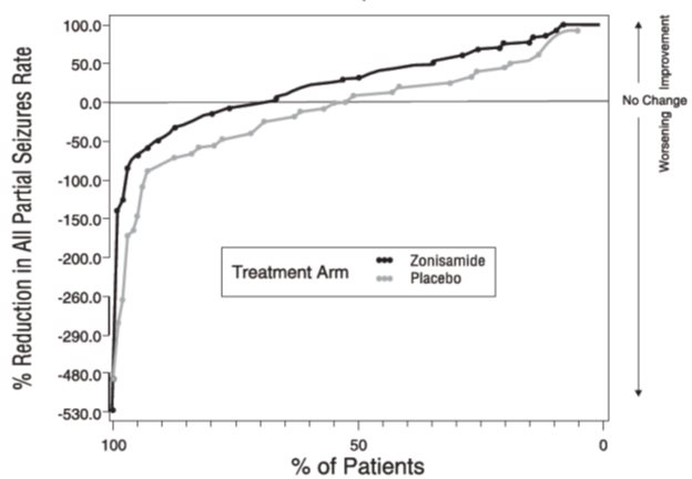 Figure 1 presents the proportion of patients (X-axis) whose percentage reduction from baseline in the all partial seizure rate was at least as great as that indicated on the Y-axis in the second and third placebo-controlled trials. A positive value on the Y-axis indicates an improvement from baseline (i.e., a decrease in seizure rate), while a negative value indicates a worsening from baseline (i.e., an increase in seizure rate). Thus, in a display of this type, the curve for an effective treatment is shifted to the left of the curve for placebo. The proportion of patients achieving any particular level of reduction in seizure rate was consistently higher for the zonisamide groups compared to the placebo groups. For example, Figure 1 indicates that approximately 27% of patients treated with zonisamide experienced a 75% or greater reduction, compared to approximately 12% in the placebo groups.