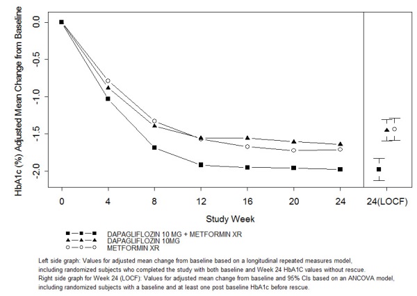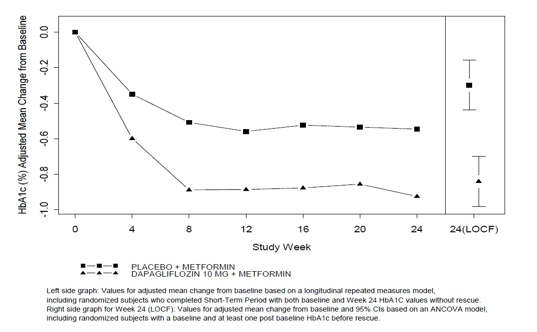 Data from a prespecified pool of adult patients from 8 short-term, placebo-controlled trials of dapagliflozin coadministered with metformin hydrochloride immediate- or extended-release was used to evaluate safety. This pool included several add-on trials (metformin hydrochloride alone and in combination with a dipeptidyl peptidase-4 [DPP4] inhibitor and metformin hydrochloride, or insulin and metformin hydrochloride, 2 initial combination with metformin hydrochloride trials, and 2 trials of patients with CVD and type 2 diabetes mellitus who received their usual treatment [with metformin hydrochloride as background therapy]). For trials that included background therapy with and without metformin hydrochloride, only patients who received metformin hydrochloride were included in the 8-trial placebo-controlled pool. Across these 8 trials, 983 patients were treated once daily with dapagliflozin 10 mg and metformin hydrochloride, and 1185 were treated with placebo and metformin hydrochloride. These 8 trials provide a mean duration of exposure of 23 weeks. The mean age of the population was 57 years and 2% were older than 75 years. Fifty-four percent (54%) of the population was male; 88% White, 6% Asian, and 3% Black or African American. At baseline, the population had diabetes for an average of 8 years, mean hemoglobin A1c (HbA1c) was 8.4%, and renal function was normal or mildly impaired in 90% of patients and moderately impaired in 10% of patients.