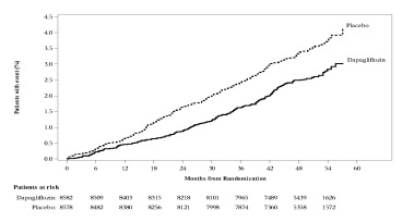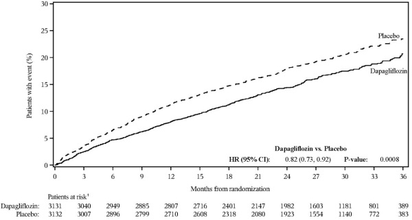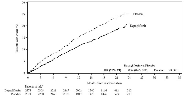 | * Genital mycotic infections include the following adverse reactions, listed in order of frequency reported for females: vulvovaginal mycotic infection, vaginal infection, vulvovaginal candidiasis, vulvovaginitis, genital infection, genital candidiasis, fungal genital infection, vulvitis, genitourinary tract infection, vulval abscess, and vaginitis bacterial. (N for females: Placebo=677, dapagliflozin 5 mg=581, dapagliflozin 10 mg=598). † Urinary tract infections include the following adverse reactions, listed in order of frequency reported: urinary tract infection, cystitis, Escherichia urinary tract infection, genitourinary tract infection, pyelonephritis, trigonitis, urethritis, kidney infection, and prostatitis. ‡ Increased urination includes the following adverse reactions, listed in order of frequency reported: pollakiuria, polyuria, and urine output increased. § Genital mycotic infections include the following adverse reactions, listed in order of frequency reported for males: balanitis, fungal genital infection, balanitis candida, genital candidiasis, genital infection male, penile infection, balanoposthitis, balanoposthitis infective, genital infection, and posthitis. (N for males: Placebo=716, dapagliflozin 5 mg=564, dapagliflozin 10 mg=595). |