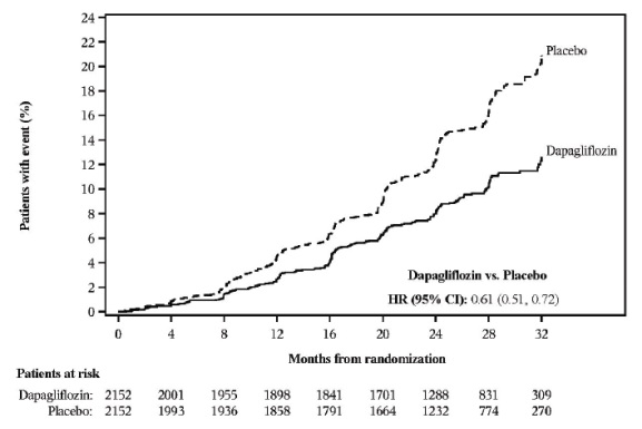 Dapagliflozin when used as a component of dapagliflozin and metformin hydrochloride extended-release tablets, are indicated in adults with type 2 diabetes mellitus to reduce the risk of:
